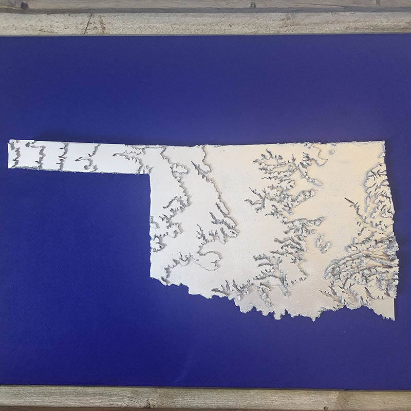 Oklahoma's topography represented 3-dimensionally with layers of foam board.